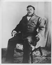 During the king's week-long stay in San Francisco, the city absorbed all costs.[36] Consul Severance acted as the royal greeter for the in-suite November 30 public reception.[38] The following morning, Severance and the king's entourage sat for a portrait at the Bradley and Rulofson photograph gallery.[39] Celso Caesar Moreno, who would later serve in the king's cabinet,[40] presented himself as owner of three telegraph cable charter companies, regaling Kalākaua with his tales of global adventures.[41]