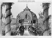 The Kalākaua group arrived in London the evening of July 6. The king spent the next day receiving visitors in his suite at Claridge's, later accepting Queen Victoria's offer of the royal box at the Royal Opera House, Covent Garden. While in England, he attended an Eton v Harrow cricket match, and returned to the Royal Opera House to hear opera singer Adelina Patti.[59] The Queen's annual Windsor Great Park review of 50,000 military volunteers drew many high-ranking and titled spectators, including Kalākaua.[69] Following the review, he was entertained by Civil Lord of the Admiralty Thomas Brassey and his wife at their encampment.[70] He attended worship services at Westminster Abbey on Sunday, prior to his afternoon sailing trip with Lord Charles Beresford and guests.[59]