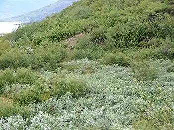 The Kalaallit Nunaat Arctic Steppe ecoregion covers the low coastal areas of western and southern Greenland, reaching in up to 100 km before bare rock and ice become dominant.[1][2][3][4][5] While much of the ecoregion is bare rock or ice, about 50% of the ground is covered in moss and lichen, and another 10% in herbaceous cover, shrubs, and even small stands of trees.[4]