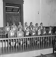 ![]() Japanese prisoners in the dock during the first war crimes trial to be held in Rangoon, Burma. These men were charged with the murder of 637 civilians in the village of Kalagon (1946). | |