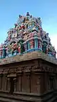 The temple has a rajagopura. To the right side of the front mandapa, the Archakasalai Pillayar Temple is found as a shrine, and to its left side a shrine of Karthikeya. Just in front of the sanctum sanctorum is a Dhwaja Stambha and in the prakara a Tulsi (Holy Basil), as well as shrines of Vinayaka, Subramania with Valli and Deivanai, Sivalinga, Nagas and Hanuman.