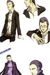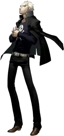 Early designs of Kanji were drastically different from the final one. He was initially given the classic gang-style pompadour. His design was made by Shigenori Soejima.[3] Kanji was given the image of an outlaw as symbolized by the skull in his clothing among other items. Nevertheless, he was created to give the impression of being nice person. He was still given an intimidating aura in order for the players to come up with several ideas to how he is before reaching his first appearances. His hairline was made to look nearly old and strong at the same moment.[4] Both of Kanji's Personas are based on his own visual appearance,[5] with focus on his skeleton. While it was given the idea of a robot, the design instead comes across as organic instead.[6] The evolved Rakuten Maoh was instead based on Nobunaga Oda with an unintentional reference to his death incinerated as the Persona has flames.[4] Early in development, Kanji was gonna be a senior delinquent with early sketches giving the idea that he is also a musician.[7]