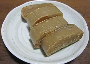 Kankoro mochi (かんころもち, the kanji representation 甘古呂餅 is a registered trademark) is a type of mochi mixed with parboiled sweet potato. It is a regional cuisine and wagashi originating from the Gotō Islands in Nagasaki Prefecture.