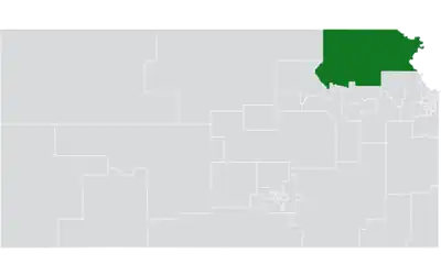 The district overlaps with Kansas's 1st and 2nd congressional districts, and with the 51st, 61st, 62nd, 63rd, and 106th districts of the Kansas House of Representatives.[4] It borders the states of Missouri and Nebraska.[1]