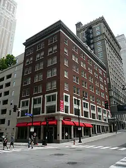 The facade is divided into three bays on Walnut Street and seven bays on 10th Street.[3] The structure is built of reinforced concrete with a red-colored brick facade. Cream-colored terra cotta decorates the base.[4]