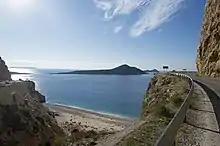 The beach is situated at a distance of 20 km from Kaş and 7 from Kalkan, at a point where an extremely narrow valley towered by steep cliffs and forests joins the sea shore in the cove of the same name as the beach (Kaputaş).[1] The beach is popular among visitors to the region due to its natural environment and views from the heights traversed by the State road D400 between Kaş and Kalkan.