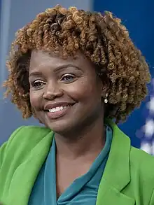 Karine Jean-Pierre (born August 13, 1974)[lower-alpha 1] is an American political advisor who has served as the White House press secretary since May 13, 2022. She is the first black person and the first openly LGBT person to serve in the position.[2] Previously, she served as the deputy press secretary to her predecessor Jen Psaki from 2021 to 2022 and as the chief of staff for U.S. Vice Presidential candidate Kamala Harris during the 2020 presidential campaign.[3][4][5]