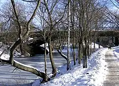 Two bridges are stretching over the canal: Modest in size Ekelundsbron (formerly Karlbergsbron), offering a maximum vertical clearance of 5.1 m,[1] is over-shadowed by the forest of massive concrete pillars and wide roadways of the Essingeleden motorway passing high above the idyllic rural scenery below.