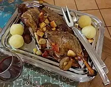 The dumplings are simmered; some recipes call for them to be allowed to cool then fried.[2] They are served hot as a side dish, often with a roast, roulade, stew, or sauerbraten, with or without a sauce or gravy.[1][4][7]