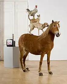 "Pyramid of Animals" was her 1993 graduate piece, which became a sensation and "object of violent controversy" in Poland at the time.[5] The piece consisted of the dissected and taxidermied animal bodies of a horse, dog, cat, and rooster and a video depicting the killing of the horse.[1] While quoting a theme from Grimm Brother's fairy tale The Bremen Town Musicians, the work concerns human involvement in industrial animal killing procedure and the normalization of murder when part of the food chain.[5][6] It was also said that this piece wasn't just, "a work about animals, but a work about death, about killing, and their significance in present day culture".[7] Kozyra became known as a controversial artist because of the notoriety with the installation, but also because of her other works: "Blood Relationship" (1995), "Olympia" (1996), "Bathhouse" (1997), and "Man’s Bathhouse" (1999).[8]