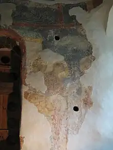 The altar screen's templon was placed below these frescoes. The iconostasis is likely to originally include 2 icons only, which illustrate the Saviour and Our Lady. The altar was hidden behind a curtain fastened to the templon[4] - the painter used the special art device to drop a hint on that by painting the edges of a curtain.