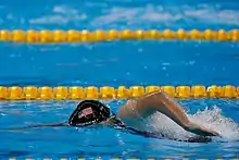 At the 2012 Summer Olympics in London, Ledecky qualified to swim in the final of the 800-meter freestyle by placing third overall in the heats with a time of 8:23.84.[33] In the final, Ledecky stunned the field, winning gold by more than four seconds, with a time of 8:14.63, the then second-fastest effort of all time just behind Rebecca Adlington's world record of 8:14.10 set in 2008.[34] In addition, she broke Janet Evans' American record of 8:16.22 that had stood since 1989. In the final, Ledecky went out hard and, by the 200-meter mark, she had already established an almost body-length lead. Her 400-meter split was 4:04.34, a personal best for Ledecky in that distance, and would have placed fifth in the individual 400-meter freestyle. At the 750-meter mark, Ledecky was 3.42 seconds ahead of Mireia Belmonte García, and 0.31 seconds under world record pace. Ledecky won by 4.13 seconds and just missed the world record by 0.53 seconds. Her gold was the first international medal of her career, earning her the 2012 Best Female Performance of the Year and Breakout Performer of the Year at the Golden Goggle Awards.