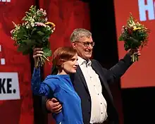 In August 2020, Kipping and Riexinger announced they would step down as co-chairs in accordance with party regulations stating that no position should be held by the same person for more than eight years.[17] The party congress due to elect their successors was scheduled for October/November 2020, but was delayed due to the worsening of the COVID-19 pandemic in Germany. It ultimately took place digitally in February 2021. Kipping, as the designated female co-chair, was succeeded by Janine Wissler; Riexinger was succeeded by Susanne Hennig-Wellsow.[18]