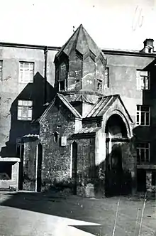 After the 1679 Yerevan earthquake, a large basilica named after the Holy Mother of God was built between 1693 and 1695, in the ancient Shahar district of Yerevan, occupying the western edge of the Katoghike Church. The new church was built of typical Armenian tuff stones and did not have dome. It belonged to the three-nave basilica type of the Armenian church architecture. The church with its prayer hall measuring 14.0 x 19.3 meters, and an outside perimeter of 16.4 x 28.4 meters, was considered one of the most capacious churches of old Yerevan. The church had entrances on the southern and western sides.[2]