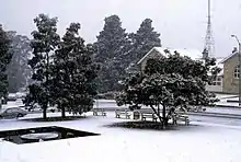 The Blue Mountains has a reputation for snow in winter. However, despite the cool temperatures, there are only around five snowy days per year in the upper mountains area. It is extremely rare to see snow below Lawson. It is not unusual to see white blankets of frost covering the ground in the early morning hours. In the evening, thick coverings of ice can form on car windscreens.[8]