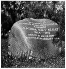 Murat was a member of the Daughters of the American Revolution. She died on March 13, 1910,[4] and was buried near Henri in Riverside Cemetery.[5] To commemorate her services, a boulder of silver plume granite was placed on her grave, bearing the inscription:— "In memory of the maker of the first United States Flag in Colorado, Katrina Wolf Murat 1824–1910, Erected by Denver Chapter Daughters of the American Revolution."[1][4]