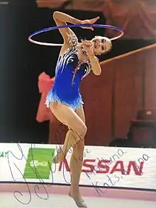 In 2016, Halkina started her season at the 2016 L.A. Lights where she won the all-around silver medal behind Ukrainian Ganna Rizatdinova. She then finished 12th in the all-around at the 2016 Grand Prix Moscow.[19] On February 26–28, she competed at the 2016 Espoo World Cup finishing 7th in the all-around with a total of 70.350 points.[20] On March 12–13, Halkina competed at the MTM Tournament in Ljubljana, Slovenia finishing 5th in the all-around with a total of 70.300 points,[21] At the 30th Thiais Grand Prix event in Paris, Halkina finished 6th in the all-around and qualified for 3 apparatus finals.[22] On April 1–3, Halkina competed at the 2016 Pesaro World Cup where she finished 13th in the all-around and qualified for hoop, ball finals. On May 14–16, Halkina then finished 5th in the all-around with a total of 72.700 points at the 2016 Grand Prix Bucharest behind Georgia's Salome Pazhava, she qualified to all apparatus finals and won bronze in ball (tied with Dina Averina). She finished 4th in the all-around at the 2016 Minsk World Cup and qualified to all 4 apparatus finals, finishing (4th in hoop, clubs, ribbon) and 8th in ball.[23] Halkina finished 11th in the all-around at the 2016 Guadalajara World Cup and qualified to 3 apparatus finals.