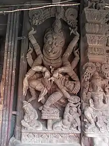 Namaskaramandapa, in front of the sanctum is square shaped. The inner roof of the Namaskaramandapam is full of beautiful carvings. Navagraha sculptures in the centre and the story of ramayana, from Rama's birth to Hanuman's Lankadahana is arranges here in three layers. The rafter shoes of the Mandapa was also bronze covered, but these 36 pieces are missing now. The inner roof of Vathilmadam (Koothumaadam) and Balickalppura are also abundant with sculptures. Due to the height and small size of sculptures, those on the Vathilmadam are not visible clearly. The Balickalpura sculptures include some poses from Kamasastra too. These sculptures belongs to late sixteenth or early seventeenth century.[15][16] The wood work of this temple was done by local sculptors of the Thekkethil family.