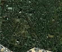 An aerial view of the station in 1974, with the alignment of the former link from the JNR tracks north of the station to the Seibu Shinjuku Line visible
