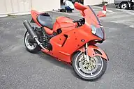 The Kawasaki Ninja ZX-12R is a motorcycle in the Ninja sport bike series made by Kawasaki from 2000 through 2006. The 1,199 cc (73.2 cu in) inline-four engine produced 178 hp (133 kW) at low speed, and increased to 190 hp (140 kW) at high speed due to its ram-air intake,[8][9][10] making it the most powerful production motorcycle up to 2006 and the release of the ZX-14.[6][11] It was a contender to be the fastest production motorcycle, and played a role in bringing to a truce the escalating competition to build an ever-faster motorcycle. Its top speed was electronically limited to 186 mph (300 km/h), tying it with the Suzuki Hayabusa and Kawasaki Ninja ZX-14 as the fastest production motorcycle on the market, after the 303–312 km/h (188–194 mph) 1999 Hayabusa was replaced with a speed-limited version as part of a gentlemen's agreement between motorcycle manufacturers that lasted until the 298–311 km/h (185.4–193.24 mph) 2007 MV Agusta F4 R 312.[3][12][13][14]