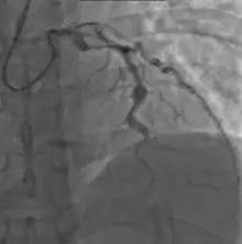 Many risk factors predicting coronary artery aneurysms have been identified,[21] including persistent fever after IVIG therapy,[56][57] low hemoglobin concentrations, low albumin concentrations, high white-blood-cell count, high band count, high CRP concentrations, male sex, and age less than one year.[58] Coronary artery lesions resulting from Kawasaki disease change dynamically with time.[4] Resolution one to two years after the onset of the disease has been observed in half of vessels with coronary aneurysms.[59][60] Narrowing of the coronary artery, which occurs as a result of the healing process of the vessel wall, often leads to significant obstruction of the blood vessel and the heart not receiving enough blood and oxygen.[59] This can eventually lead to heart muscle tissue death, i.e., myocardial infarction (MI).[59]