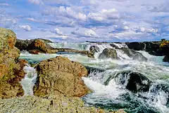 The Kazan River (Inuktitut Harvaqtuuq,[3] Inuktitut syllabics ᓴᕐᕙᖅᑑᖅ;[4] meaning "strong rapids",[5] "the big drift"[3] or "place of much fast flowing water"[4]), is a Canadian Heritage River located in Nunavut, Canada. The Dene name for the river was Kasba-tue meaning "white partridge river." The name was apparently changed to Kazan in the late 19th century due to the influence of Order of Mary Immaculate missionaries.[6] The river headwaters are in northern Saskatchewan[7] at Kasba Lake, and it flows north for about 1,000 kilometres (620 mi)[7] before emptying into Baker Lake (64°09′00″N 95°30′00″W / 64.15000°N 95.50000°W), on the opposite side of the mouth of the Thelon River. Along its course the river flows through several lakes, including Ennadai Lake and Yathkyed Lake, over the Kazan Falls (25 metres (82 ft)), down a red sandstone gorge[7] and through both boreal forest and tundra. It is the last section of the river, below Ennadai Lake, that is above the timber line and is designated a Canadian Heritage River.