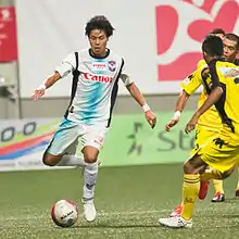 ![]() Kazuya Fukuzaki playing an S.League match against Tampines Rovers at Jalan Besar Stadium on November 1, 2013. | |||