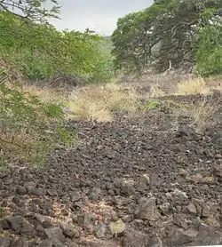 Kāneaka Hōlua Slide[3] which is better known today as the Keauhou Hōlua Slide is located in Keauhou (original name of this area was Kahaluʻu) on the island of Hawaiʻi. It is the largest historical hōlua course left in the islands. Hōlua slides were used in the extremely dangerous activity of sliding across solidified lava surface.