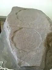 Kebon Kopi I also known as Tapak Gajah inscription (elephant footprint inscription),[1] is one of several inscriptions dated from the era of Tarumanagara Kingdom circa 5th century.[2] The inscription bearing the image of elephant footprint, which was copied from the elephant ride of King Purnawarman of Tarumanagara, which is equated with Airavata, the elephant vahana (vehicle) of Indra.[3]: 16
