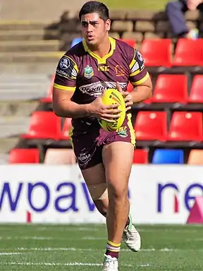 On 7 July 2019 Palasia made his NRL debut for the Broncos against the Cronulla-Sutherland Sharks. After a journey to the 2019 Intrust Super Cup grand final, Palasia sustained an ACL tear during 2019/2020 preseason and underwent his 3rd knee reconstruction, sidelining him for the entire 2020 season. This was his 5th surgery since age 17 (hand, ankle & 3 knee surgeries). In Round 11 2021, Palasia scored his first NRL try in his first game in two seasons in a 34-16 win over the Sydney Roosters. Historically a second rower with the added footwork of a back & ability to ball play throughout his career due to also playing touch football at representative levels as a youngster, Palasia has shown versatility by recently being moved into the middle in the prop & lock positions which has been a successful transition. On 1 December 2022, Palasia signed a two-year deal to join the Gold Coast starting in 2024.[2] Palasia played a total of 20 games for Brisbane in the 2023 NRL season. He played in Brisbane's 26-24 loss against Penrith in the 2023 NRL Grand Final.[3]