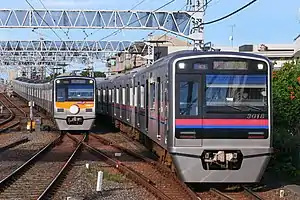 The Keisei 3000 series (京成3000形) is a DC electric multiple unit (EMU) train type operated by the private railway operator Keisei Electric Railway on commuter services in the Tokyo area of Japan since 2003.[4] A total of 19 eight-car sets and 29 six-car sets have been built by J-TREC (formerly Tokyu Car Corporation) and Nippon Sharyo between 2002 and 2019.[2]