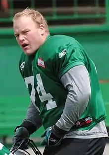 A week after he was cut by San Diego he signed with the Saskatchewan Roughriders of the Canadian Football League (CFL).[5] He joined Saskatchewan in week eight after they drafted him with the fourth pick in the 2008 draft.[1] He appeared in one game as a backup defensive lineman against the Edmonton Eskimos and recorded two tackles.[1][3] The Roughriders lost Shologan's debut by a score of 27–10.[6] During the Roughriders 2009 training camp, Shologan was called a "standout" by head coach Ken Miller, and when told about Miller's comments, Shologan responded by saying "aw shucks".[3] On August 16, 2009, Shologan scored his first ever CFL touchdown against the Hamilton Tiger-Cats as a tight end on a 1-yard reception in the end zone from Steven Jyles. After the 2010 Grey Cup, Shologan was named the game's Top Canadian for his performance, despite the Roughriders loss to the Montreal Alouettes.[7]