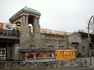 The architects for the new station were Ludwig Raabe und Otto Wöhleke, who also designed Landungsbrücken and Mundsburg stations,[3] and the stone figures decorating the station were sculpted by Johann Michael Bossard (1874-1950).[4]