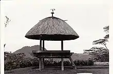 The sacred houses are built together by all men who belong to a tribe line. They meet on a weekend, once a month, for eleven months. At the end of the monthly work is always a small ritual feast celebrated. The sacred houses consist of seven levels, each with four steps. Restriction to the access depends on the degree of kinship. Simple guests are allowed only in the lowest level of the house, friends at least in the second level, married relatives in the third, relatives from neighbouring villages in the fourth and partly in the fifth, those married in the village in the sixth and only the Lulik Nain (meaning "Lord of the Holy") up to the seventh level. He is the guardian of the house and the sacred objects, which are kept here. At the inauguration of the house, a buffalo is sacrificed and a great feast is celebrated.[15]