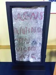 A Roman milestone dedicated to the Emperor Constantine the Great (AD 307 – 337) was found in about 1818 when ground was being levelled for a vegetable garden for Court House, opposite the west gate of the churchyard. According to O'Neil,[3] this was probably not its original position as the nearest Roman road was about one mile (2 km) away. It could have previously been used as masonry for the Bishop's Palace due to the lack of suitable building stone in Kempsey. The Victoria County History entry describes this as "an inscription found some years before 1818, lying in two pieces with other stones 4 feet (1.2 m) deep in the west wall of the kitchen garden of the parsonage farm, north-west of the church. Many of the other stones were cemented together and formed some kind of ancient foundation; whether the inscription was one of these, is not recorded. It is itself a flat slab of freestone, 33 inches (840 mm) high by 20 inches (510 mm) wide, and is now in the Worcester Museum. It reads as follows:[4]