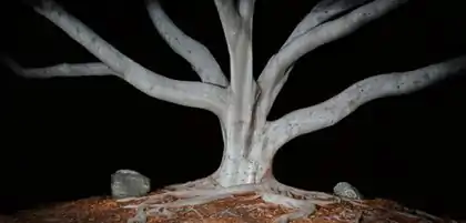 For "Searching for California Hang Trees" (2002–14), Gonzales-Day sought to visit and photograph the more than 300 California lynching sites he uncovered.[3][29][16] More performative than documentary—since many exact locations are unknown—the series' recordings and approximations feature stark, large-scale color portraits of trees, often set against flat, black backgrounds that range, according to reviews, from quietly beautiful to ordinary suburban to vaguely ominous (e.g. Nightfall I, 2007).[3][7][49] Critics suggest that the trees' twisted roots, interwoven branches, and thick trunks—suggesting age, wisdom, silent witness and a land heavy with history—offer a critical look at landscape photography and the erasure of uncomfortable legacies within seemingly pastoral locales.[50][49][51][52] In several exhibitions, Gonzales-Day juxtaposed the hang trees with his "Memento Mori" bust-length, frontal portraits of contemporary Latino men matching the lynching victims in age and ethnicity, which reviewers describe as similarly "elegant, muscular and mute."[3][7][49][16] Gonzales-Day further extended the hang tree project with a self-guided walking tour of lynching sites in downtown Los Angeles.[7]