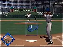 This game uses simple controls for pitching that are very similar to the controls of other baseball video games of the time. Before the pitch, there will be a menu that will show all available pitches that the pitcher can throw. In order to throw a certain pitch, you must press the button that is next to the pitch you would like to throw. The strike zone will be shown by a white rectangular box and any pitch that is located in the box will be a strike. Also, while the ball is being thrown, the pitcher may use the analog stick to move the pitch in any direction. There are several different pitches that can be thrown. They are: fastball, super fastball, change up, super change up, knuckleball, curveball, slider, and screwball. Every pitcher has his own unique set of pitches and no pitcher can throw all the pitches. The speed of the pitches can range anywhere from 37 mph to 103 mph.