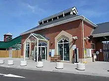 Kenilworth was revolutionised by the arrival in 1844 of the railway to the town, when the London and Birmingham Railway opened the Coventry to Leamington Line, including Kenilworth railway station. The station was rebuilt in 1884 and a new link line was opened between Kenilworth and Berkswell to bypass Coventry. This closed to all traffic on 3 March 1969.[17] The railway station was located to the south of the Finham Brook valley, and this caused the focus of settlement at Kenilworth to move south, away from the castle, and nearer to the railway station, industrialists from Birmingham and Coventry arrived, who developed the area around the town's railway station with residential and commercial developments. In the 19th century Kenilworth had some fine large mansions with landscaped gardens; these were demolished after the First World War and Second World War for housing developments. The railway also brought a number of new industries to Kenilworth, such as tanning, brick making, and chemicals, and also caused substantial growth in Kenilworth's market gardening; which became known for producing crops such as tomatoes and strawberries.[15][16]