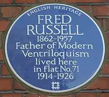 • Fred Russell (1862-1957) was an English ventriloquist. Usually credited as being the first to use a knee-sitting figure, he is known as "The Father of Modern Ventriloquism". He lived in Flat 71, Kenilworth Court, between 1914 and 1926.[13]