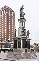 Kennedy Plaza is home to three public art works. The most prominent is the 1871 Soldiers’ and Sailors’ Monument[31] which occupies space directly in front of Providence City Hall. Dedicated originally in 1871, it was sculpted by Randolph Rogers with the pedestal designed by architect Alfred Stone. The monument was moved during the City Hall Park/ Exchange Place transformation in 1913 to the center of the plaza, and returned to its present location in 1997. Large bronze plaques on the monument’s base list residents killed in the war.[31] Another plaque honors Rhode Island's African-American veterans.[31] A dedication on a northeastern plaque reads ”Rhode Island pays tribute to the memory of the brave men who died that their country might live.”[31] In late 2016, the Downtown Parks Conservancy of Providence started a fundraising effort to restore the monument and the infrastructure immediately around it.[32]
