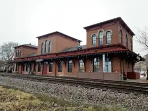 Through downtown Kent, the B&O tracks are just west of the Erie tracks, between the Erie rails and the Cuyahoga River on a lower level closer to the river. The B&O line was originally built in the 1880s by the Pittsburgh and Western Railroad after the Erie line had been established, and is known to locals as the "lower tracks". Kent's first B&O station was a box car located adjacent to the south side of the Main Street Bridge just below the Erie depot. This depot was accessible from the bridge using a staircase and a luggage ramp.[18] In 1905, as part of a larger project to double-track the line, the B&O opened a new station a short distance to the south at Summit Street. This station consisted of a makeshift platform along the lower tracks extending northward from Summit Street and a small wood-frame building with a ticket window near the south end. On the south side of the street was the accompanying freight depot. B&O trains traveling between Chicago's Grand Central Station and Pittsburgh's P&LE Station could stop at Kent, but the stop was a flag stop only available on certain trains.[19] Passenger service to this station ended April 30, 1971. The passenger depot, owned by B&O successor CSX Transportation, still exists as of 2023, though it was damaged by fire in 2013. Its accompanying freight depot was razed in 2010.[20]