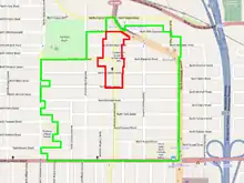 Kenton's principal commercial district is located on North Denver Avenue, extending roughly four blocks south from North Interstate Avenue, where the Paul Bunyan statue stands. The district was developed mainly between 1910 and 1949, and contains an unusually high concentration of buildings constructed using ornamental concrete blocks. The area developed directly as an outgrowth of Swift & Company's decision to run a streetcar line along the street from its stockyards to the rest of the Portland streetcar network. The district was listed on the National Register of Historic Places in 2001 for its role in the development of the neighborhood and the city.[2]