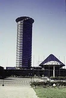 The KICC currently stands as the ninth tallest building in Kenya, reaching a height of just over 105 metres.[15] It succeeded the Hilton Nairobi as the tallest building in Kenya, a position it held for 26 years before being surpassed by Teleposta Tower. The tower consists of 32 floors, including a revolving restaurant which offers panoramic views of the city, rotating 360° in 76 minutes.[16] The building's light terracotta façade reflects traditional African architecture, as does the use of simple solid shapes- cuboids make up the Plenary hall, the tower consists of a cylinder composed of several cuboids and the amphitheatre and helipad both resemble cones.[17]