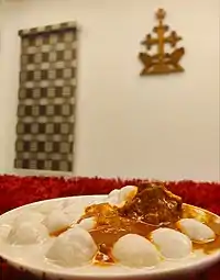 A favourite dish of Kerala Christians is mappas, or ishtu.[14] For this dish, chicken/ beef, potatoes, carrots, green peas and onions are simmered gently in coconut milk flavoured with black pepper, cinnamon, coriander, mint, cloves, green chillies, lime juice, and shallots . In Central Kerala, this is made only with beef or lamb, the usage of chicken in stew is very rare.[15] Lamb and duck can replace chicken in the stew recipe.