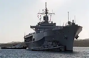 A starboard bow view of USS Blue Ridge (LCC-19) being assisted by Ketchikan (YTB-795) and another tug, while docking at Sierra Pier, Naval Station Guam during Exercise TANDEM THRUST '99.
