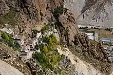 The hermitage complex is enclosed by compound walls with an east gate and a west gate of entry. It has images installed in temples and chapels; all are new. In a small chapel near the west gate Acala (Mi g.yo ba)‘s self manifest image is seen (it was earlier on a boulder rock that was moved into the shrine, into a more sanitised and sanctified location) in the Dharma courtyard (chos rwa). The main temple is in the centre of the enclosed courtyard. It is a double-storied building with an assembly hall (’du khang). The second floor oaccommodates the reception and committee rooms. The monastery also has a community kitchen adjoining the living quarters for the monks. A guest house is part of the complex of buildings.[3]