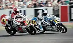 In 1987, he got his break in the 500cc world championship with three wildcard appearance on the Kenny Roberts Yamaha team. Crashing in the opening Japanese Grand Prix, he earned a point in the rain-affected Dutch TT before scoring an impressive third place in his third ever Grand Prix at the Portuguese Grand Prix round. Having teamed up with Martin Wimmer to win the 1987 Suzuka 8 Hours endurance race, and having also won the 1987 round of the now-defunct Formula 1 motorcycle championship at Sugo, he became the only rider to stand on the podium of three different World Championships in a calendar year.[2][3]