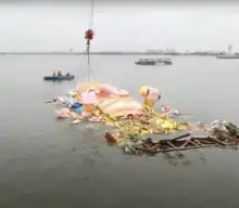 The Khairatabad Ganesh, along with several thousand other idols in the city, are immersed in the Hussain Sagar lake on the last day of the festivities.[lower-alpha 4] The idol is taken on a shobha yatra (transl.Radiant journey), an immersion procession rally in the city.[26] Massive trolley pulls up the idol with the help of advanced cranes from Khairtabad to Hussain Sagar. The Khairatabad Ganesh idol is taken on a direct route to the lake at Tank Bund Road, while other idols are taken in a longer procession route around the city. Once the idol reaches the lake, cranes, fitted with specialized equipment in the recent years, lift up the idol and immerse it in the lake.[27][28]