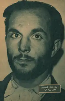 Khalil Tahmasebi (14 February 1924 – 21 January 1955) was a carpenter and member of the Iranian fundamentalist group[1] Fadayan-e Islam ("Self-Sacrificers of Islam"[2]), which has been described as "the first Shiite Islamist organization to employ terrorism as a primary method of political activism."[3] On behalf of this group, Tahmasebi assassinated the Iranian Prime Minister, Ali Razmara, on 7 March 1951.[4] He was described as a "religious fanatic" by The New York Times.[5] In 1952, he was freed by the Iranian Parliament during the premiership of Mosaddegh,[6] his pending death sentence was quashed, and he was declared a "Soldier of Islam."[7] According to Time, Tahmasebi "promptly rushed to the Hazrat Abdolazim shrine, wept joyously and said: 'When I killed Razmara, I was sure that his people would kill me.'"[8] Following the 1953 Iranian coup d'état, Tahmasebi was re-arrested and tried for the assassination of Razmara; he was executed in 1955.[6]