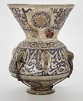 More than 300 objects in the collection illustrate the history of Islamic glass, going back to the Sasanian and Byzantine Empires.[85] Egyptian and Syrian glassmakers of the 13th and 14th centuries made lavishly decorated enamelled and gilded glassware which was in demand for export, and the collection's objects cover this period. Some of these were commissioned by the Mamluk Court for mosques, and the collection includes one created for the 14th-century Sultan Barquq,[86] decorated with his heraldic roundel.[87] Some objects are mould-blown, and the collection is numerous enough to allow comparison of multiple objects from the same or similar moulds. Other groups have cut or lustre-painted decoration. Four complete objects are decorated by a rare scratched-glass technique and have enabled a new study of the technique.[85]